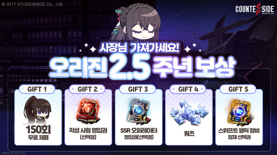 또한 자체서비스 2.5주년을 맞이하여 각성 사원 3종, 150회 무료 채용, 오퍼레이터 보조기술 선택권 등 풍성한 보상이 포함된 2.5주년 이벤트를 통해 <카운터사이드>를 방문하는 모든 유저들을 맞이할 계획이다.